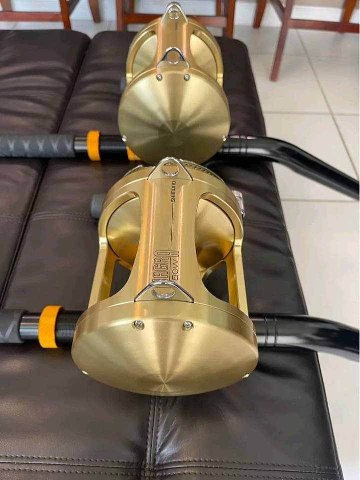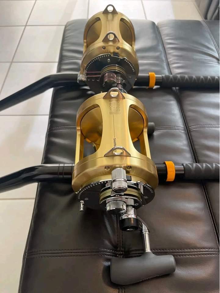 2 New Shimano Tiagra 80W 2 speed reels mounted on brand new coastal 80Ib bent butt rod.