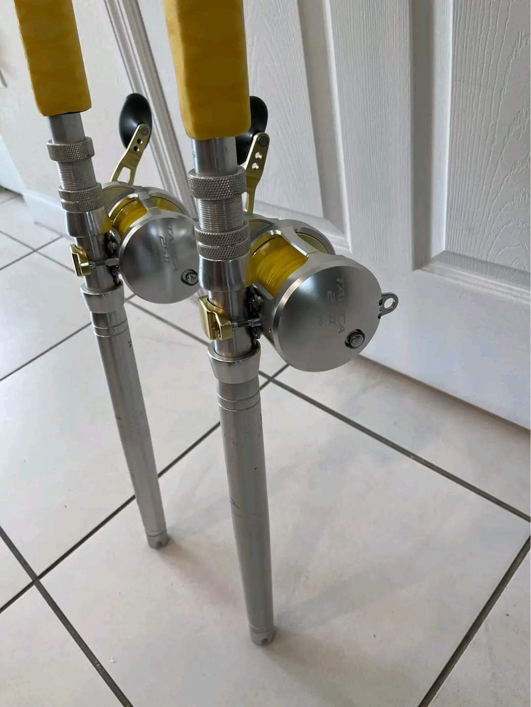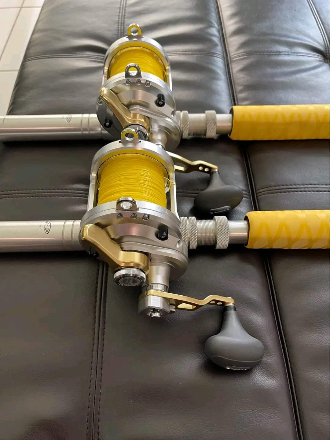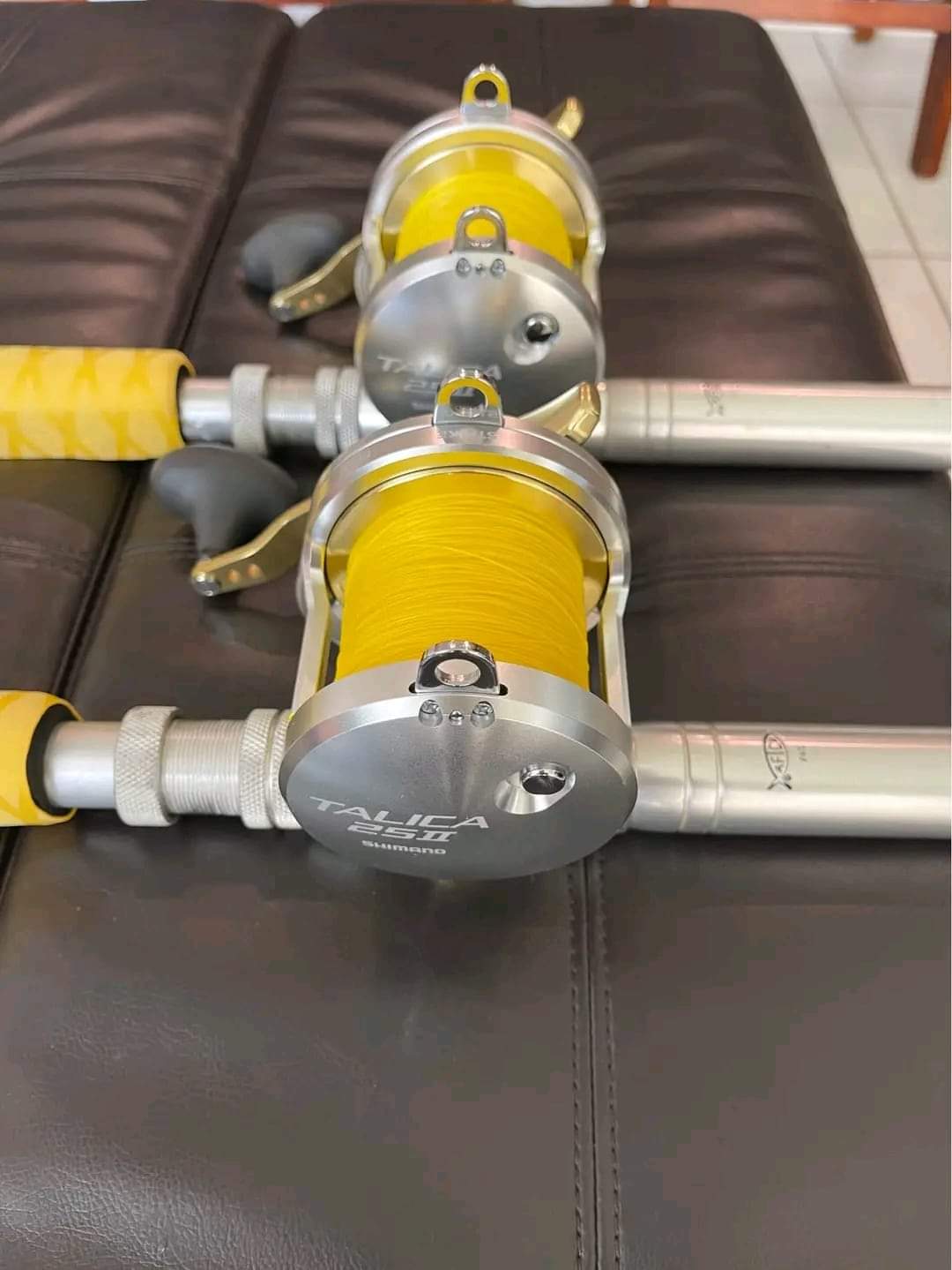 2 Shimano Talica 25II 2 speed with 80Ib braids mounted on custom two-piece rods with aluminum Aftco butts.