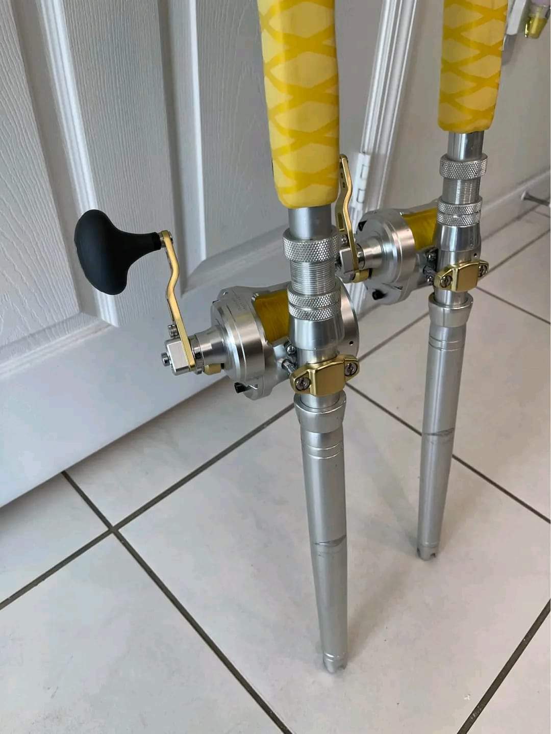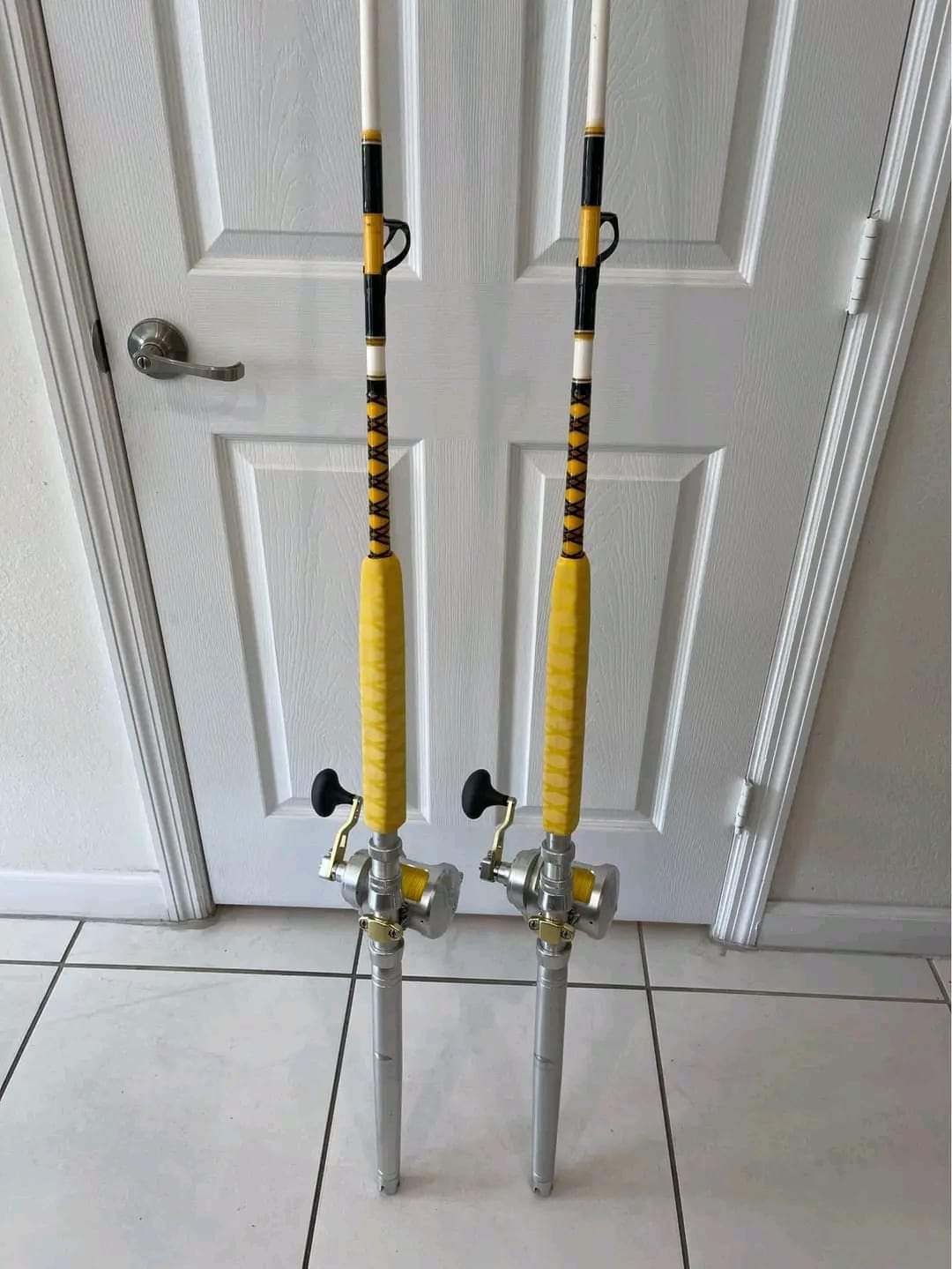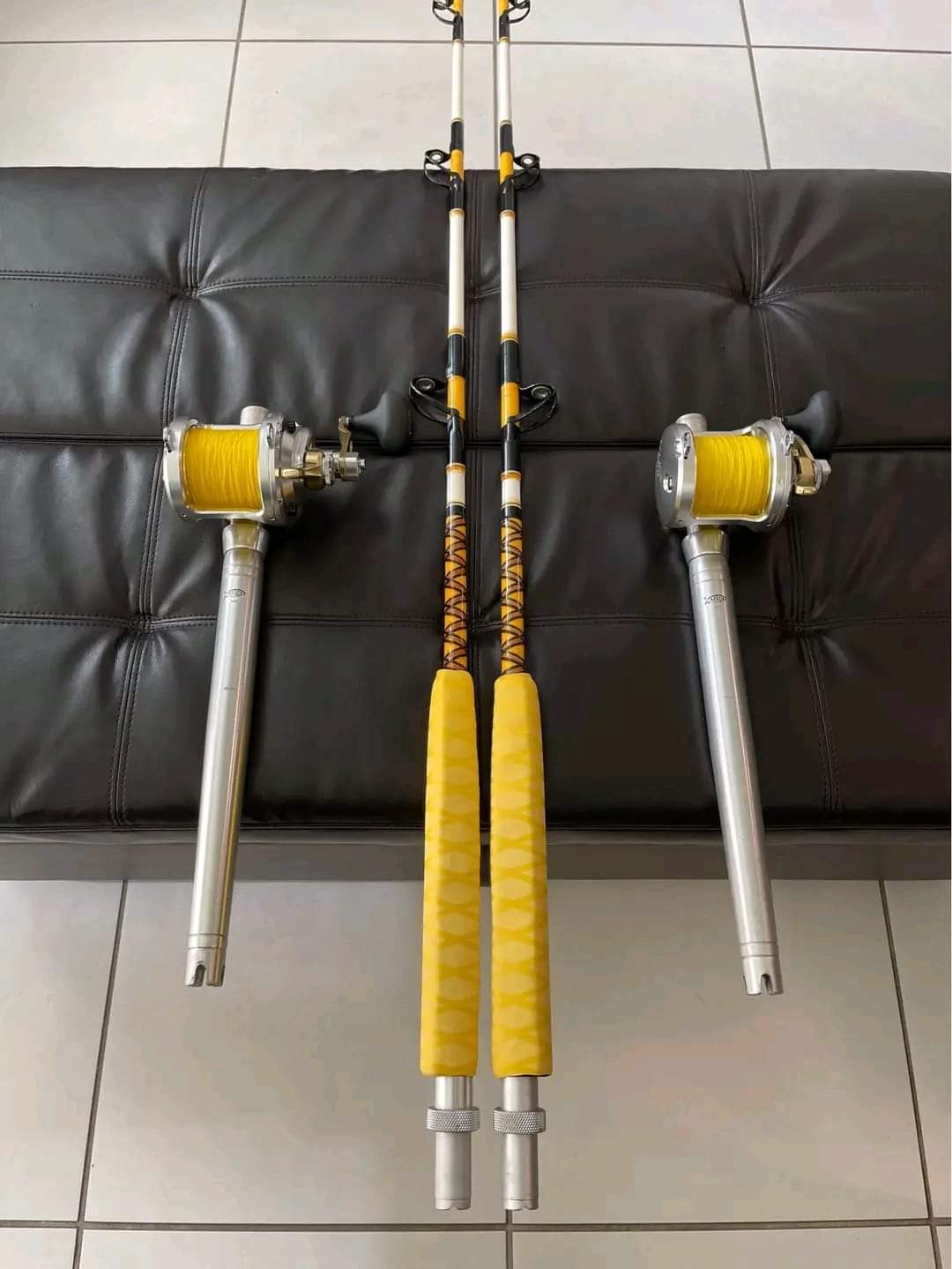 2 Shimano Talica 25II 2 speed with 80Ib braids mounted on custom two-piece rods with aluminum Aftco butts.