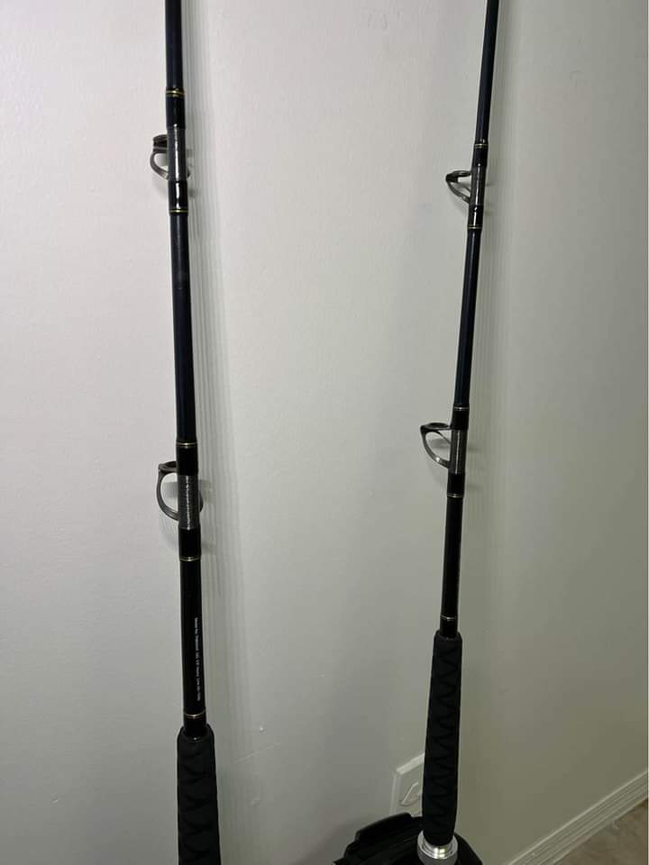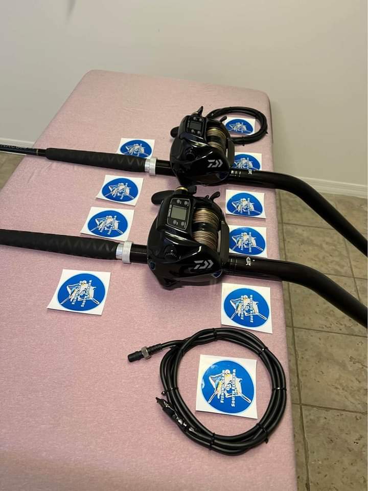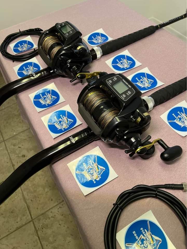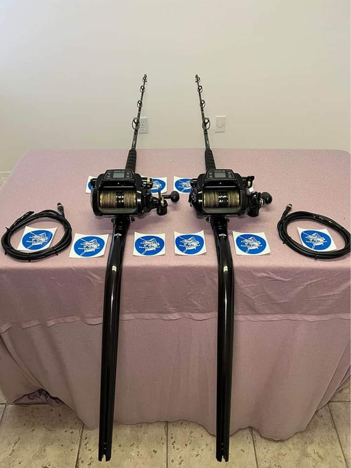 2 Tanacom 1000 electric reels with new braid. Extremely clean setup with new braid and both power cables. The rods are 5′-6′ 60-150Ib bent butts.
