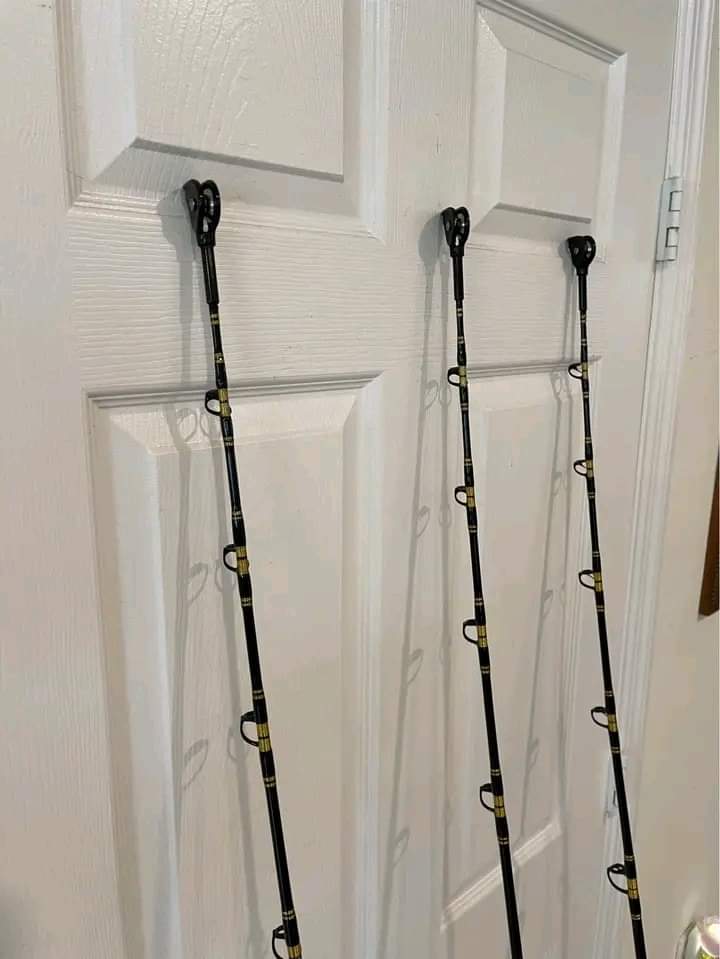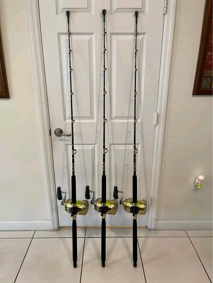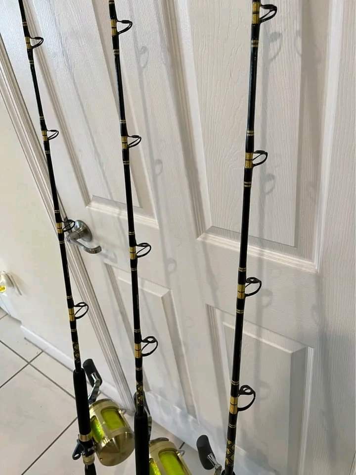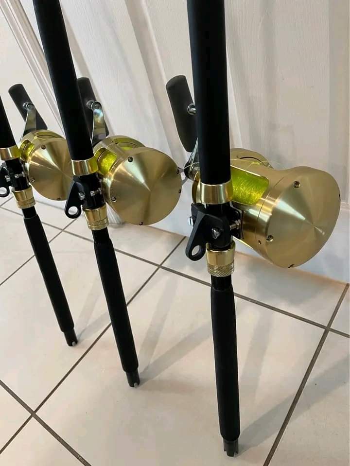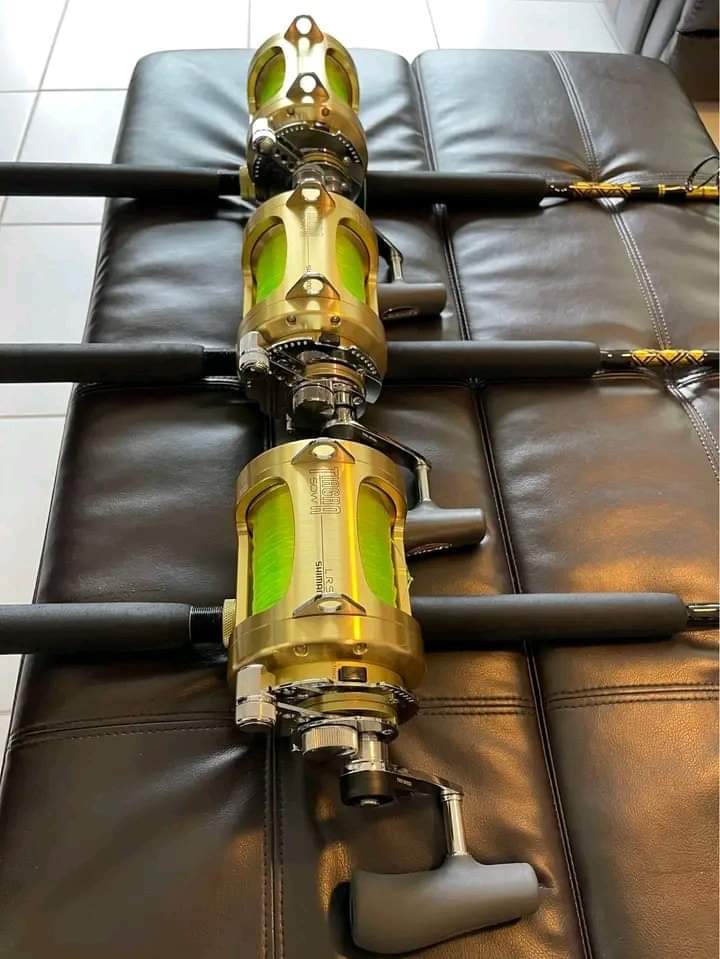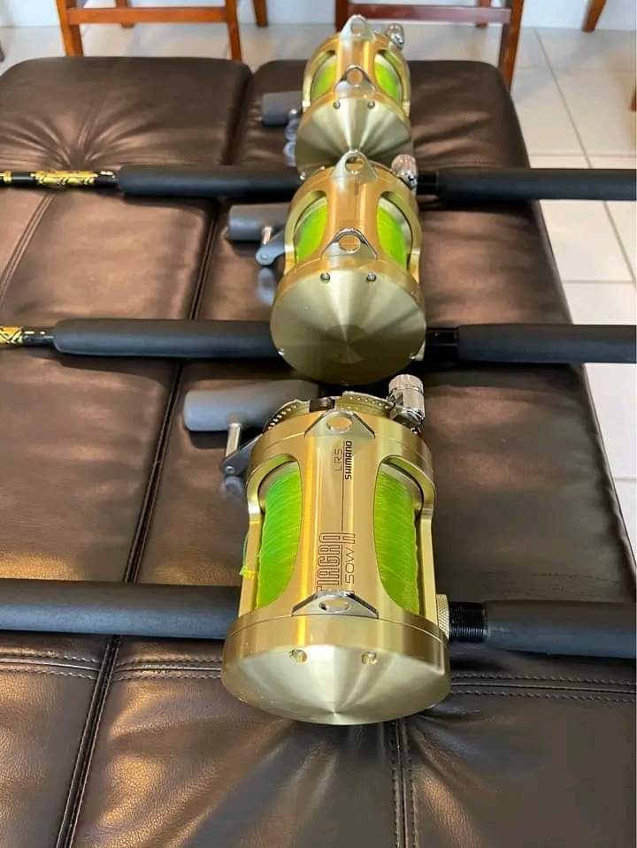 3 Shimano Tiagra 50W 2 speed reels with high viz line mounted on custom handcraft Boomerang rods VPJ 80-150Ib rods.