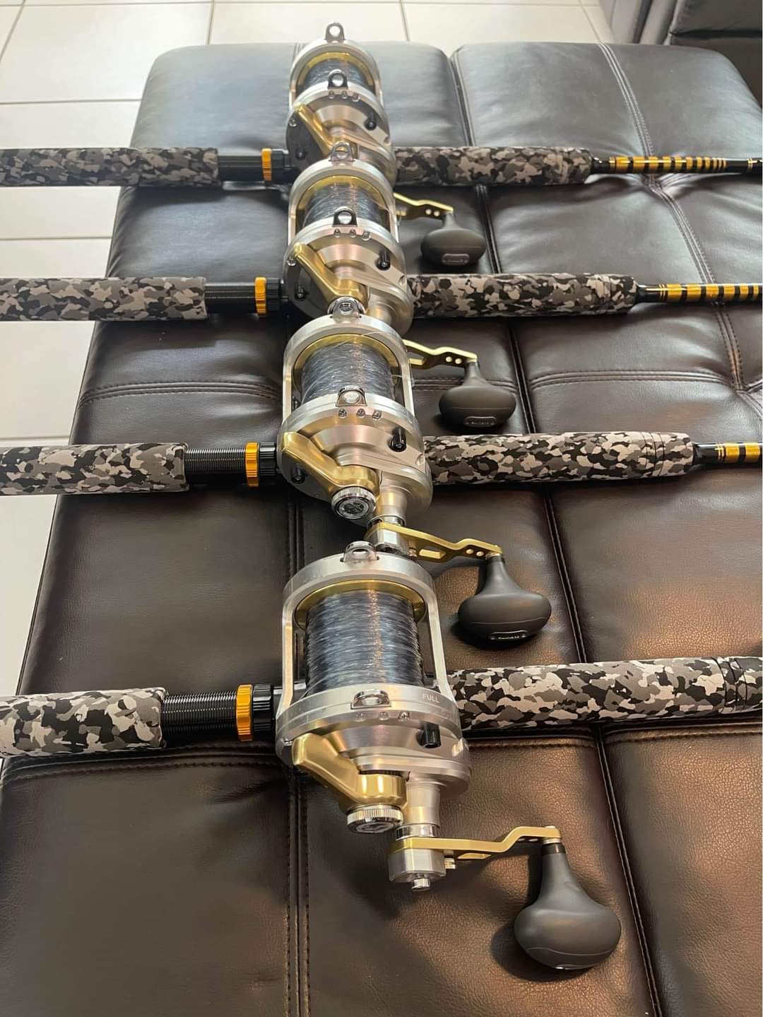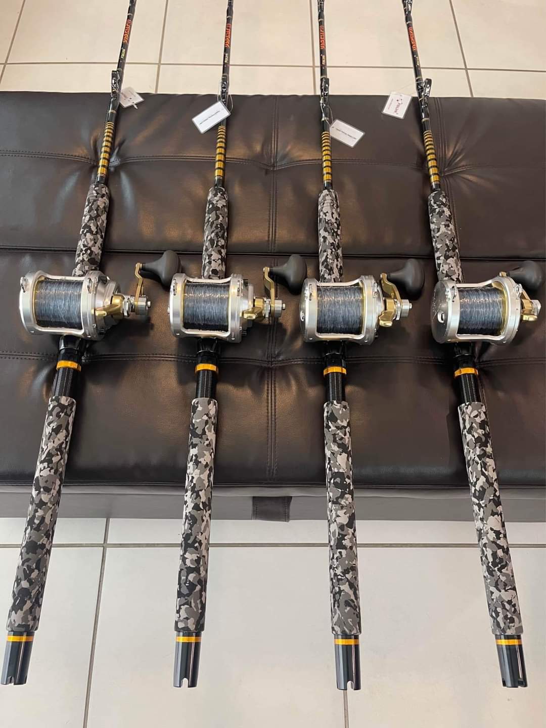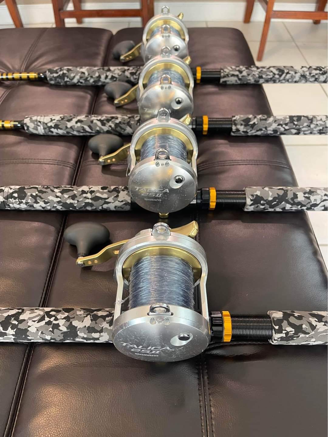 4 Shimano Talica 25II 2 speed reels mounted on brand new Fiblink Camo 30-50Ib class rods with roller guides from top to bottom.