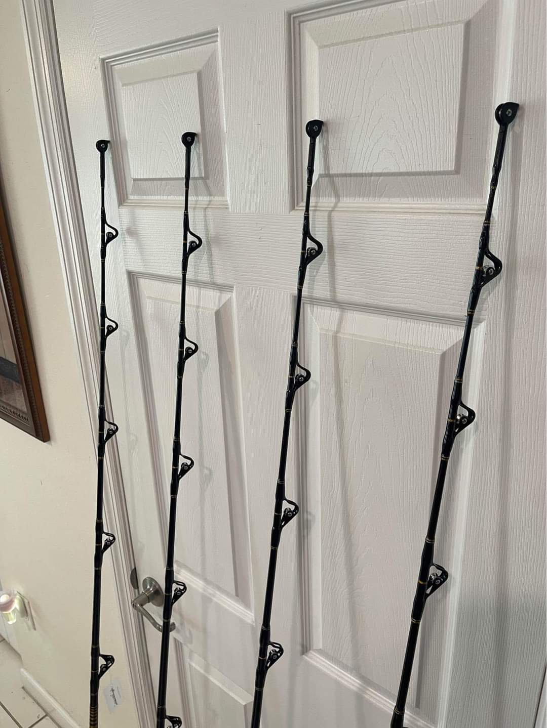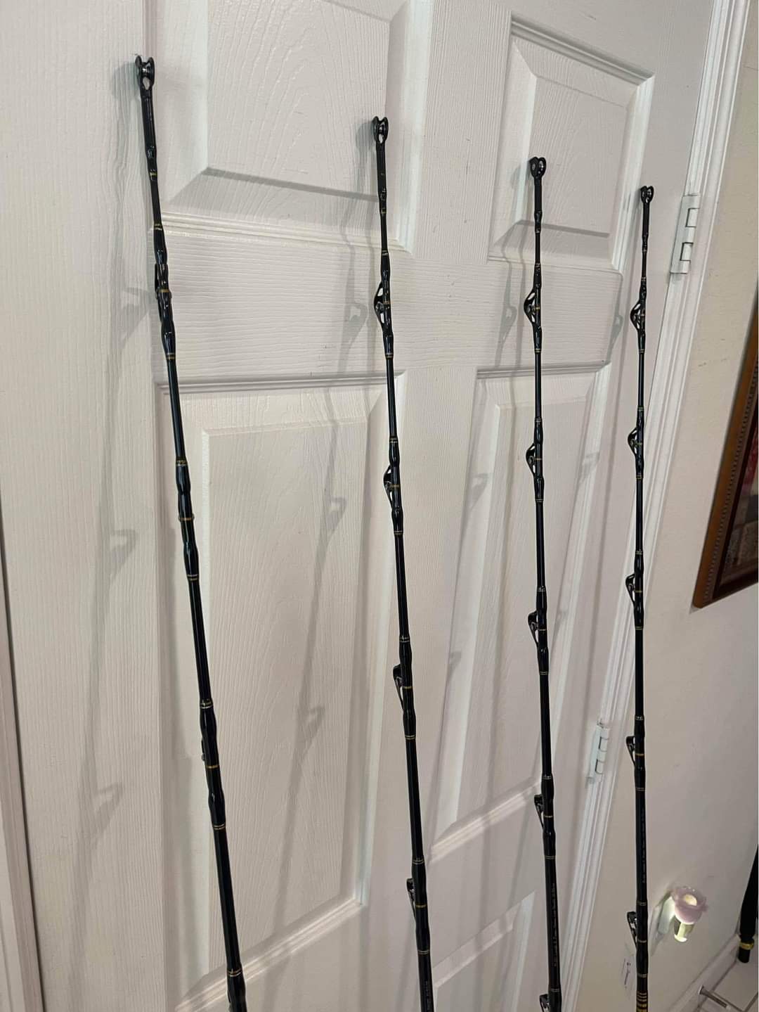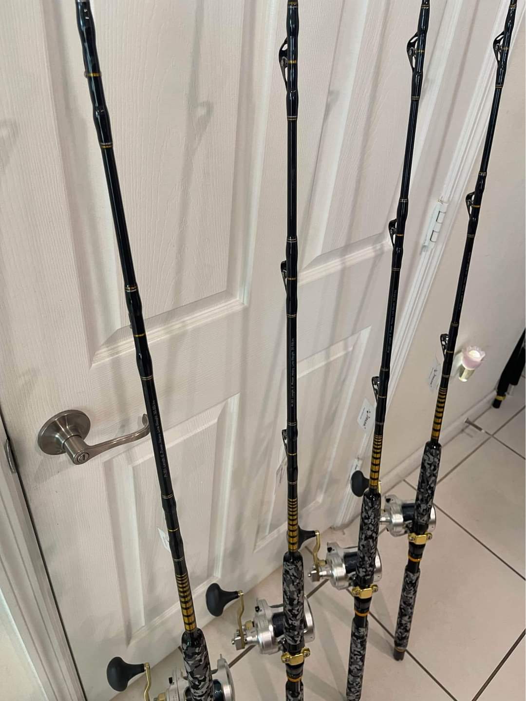4 Shimano Talica 25II 2 speed reels mounted on brand new Fiblink Camo 30-50Ib class rods with roller guides from top to bottom.
