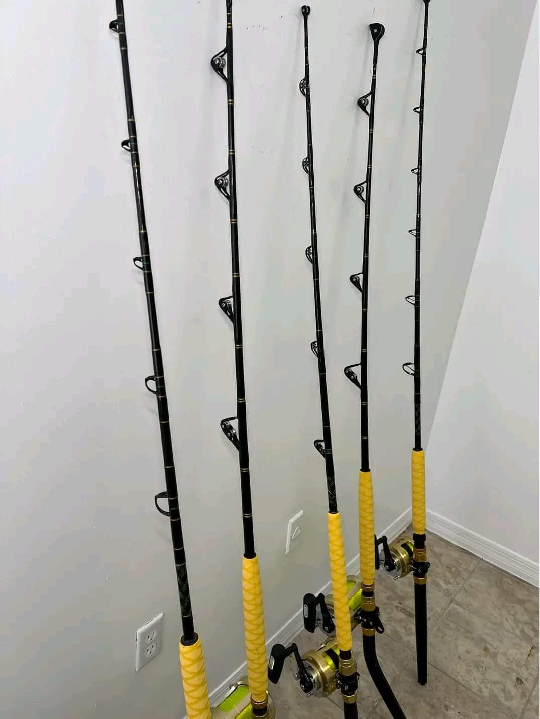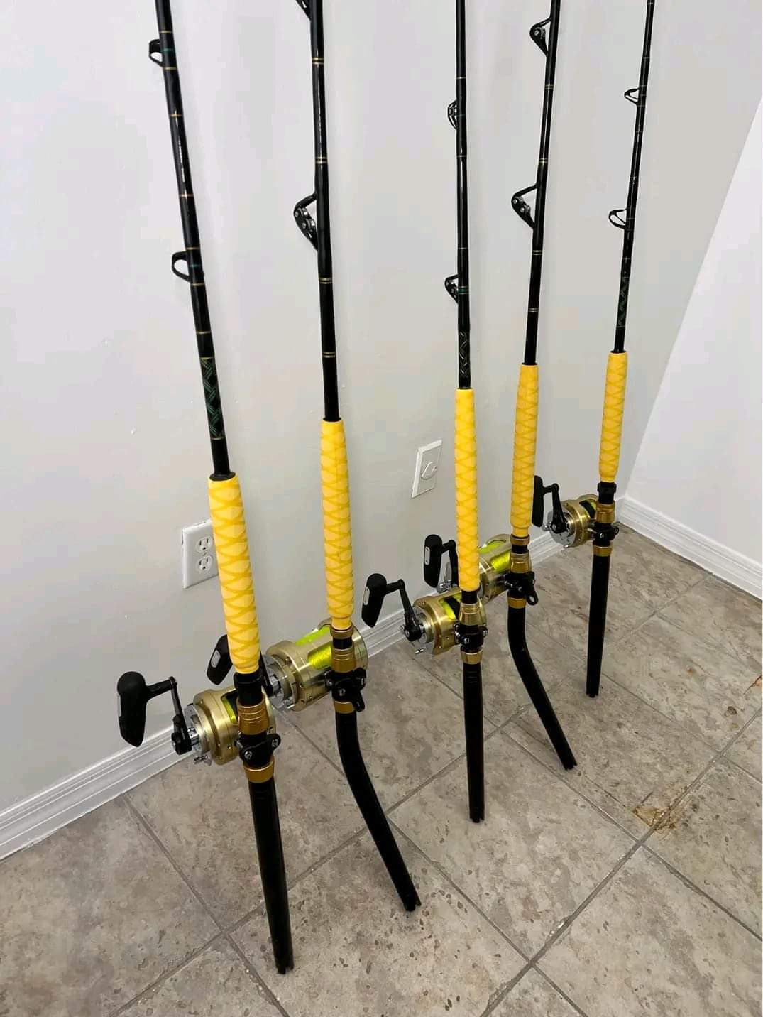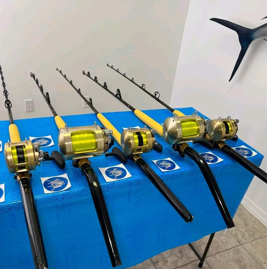 5 Shimano Tiagra 2 speed reels. Two 50WLRS 2 speed on custom 50-80Ib bent butt rods with Aftco wind roller guides and Two 20 2 speed on custom 30-50Ib 2-piece rods with straight butts and one 30 on custom 30-80Ib crook and Crook by Star rods. All five reels have braid braid and mono.