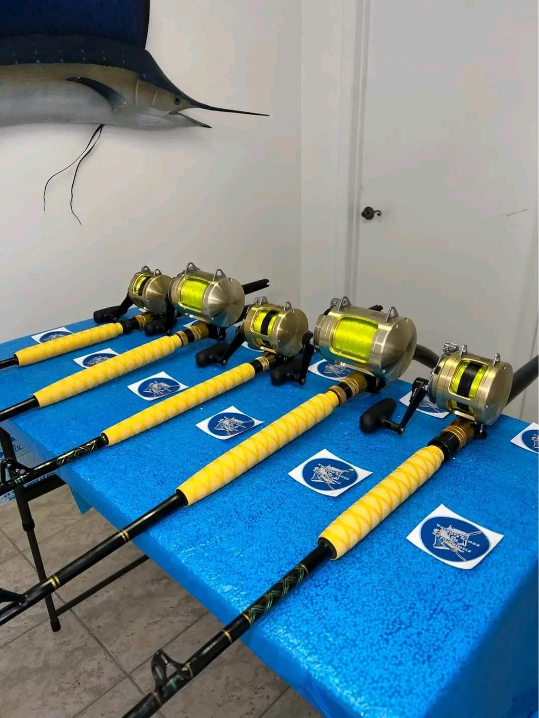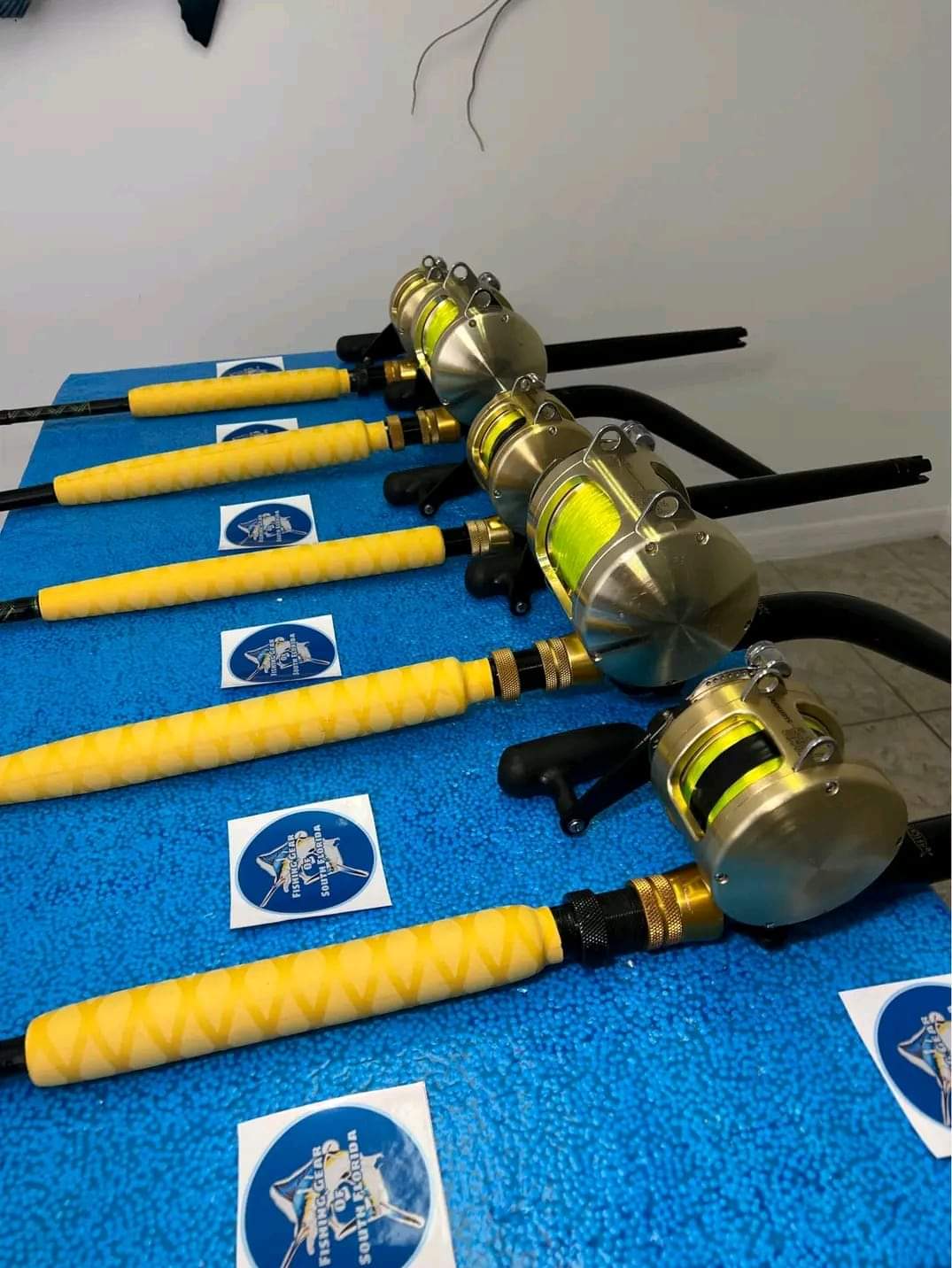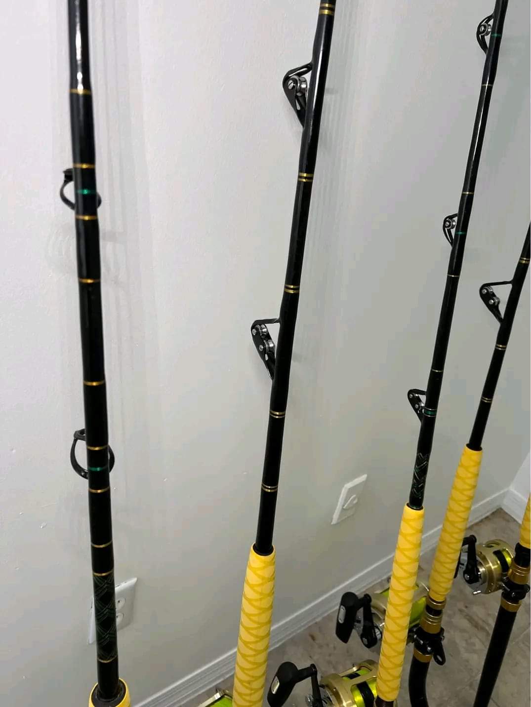 5 Shimano Tiagra 2 speed reels. Two 50WLRS 2 speed on custom 50-80Ib bent butt rods with Aftco wind roller guides and Two 20 2 speed on custom 30-50Ib 2-piece rods with straight butts and one 30 on custom 30-80Ib crook and Crook by Star rods. All five reels have braid braid and mono.